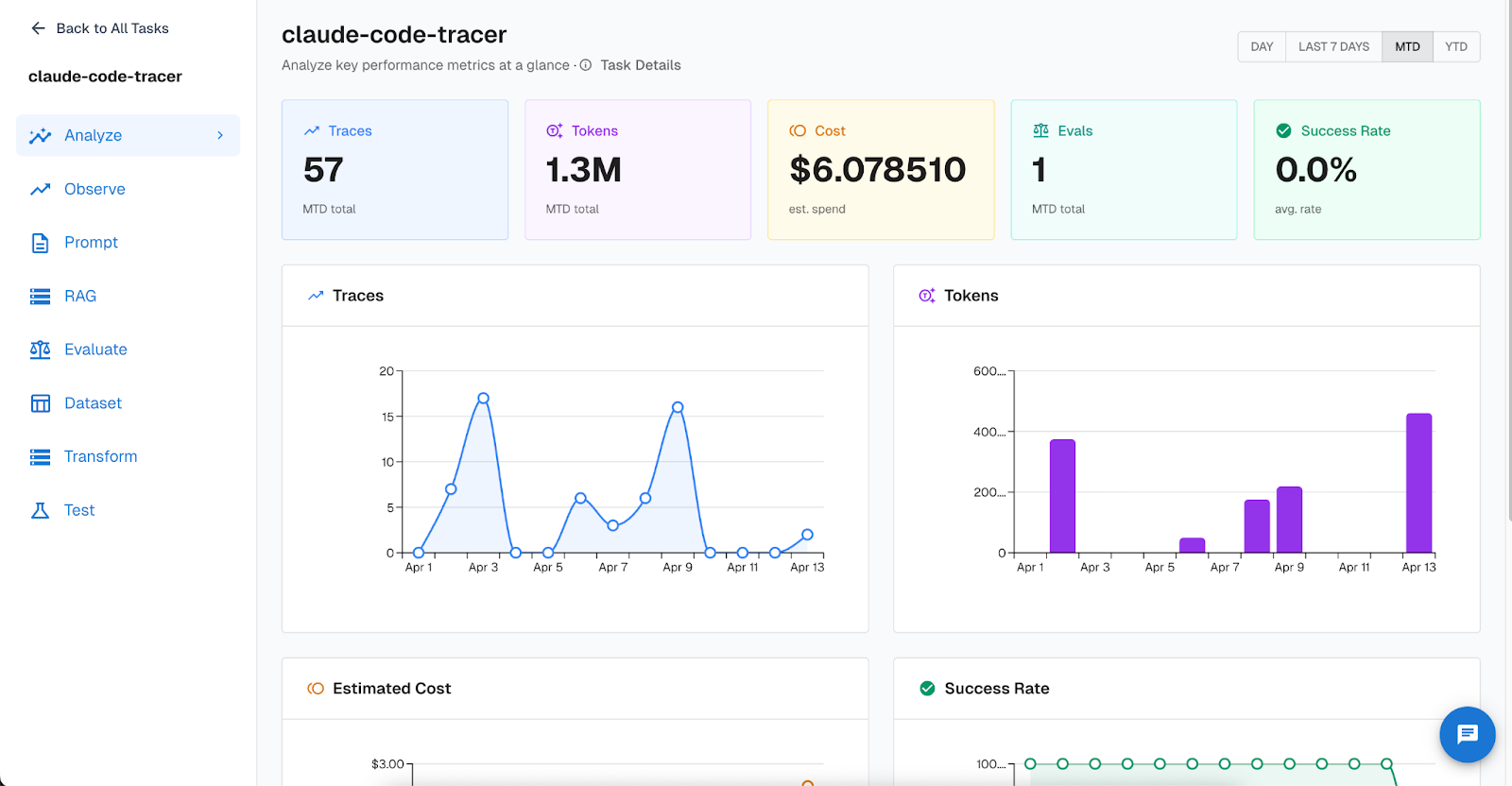 Track token usage and cost across your team. Arthur Engine's task dashboard gives you an at-a-glance view of your Claude Code usage: total traces, tokens consumed, estimated spend, and success rate over time. If you're trying to understand how much Claude Code is actually costing your team per week — or whether usage is spiking after a particular workflow change — the dashboard makes it concrete.
