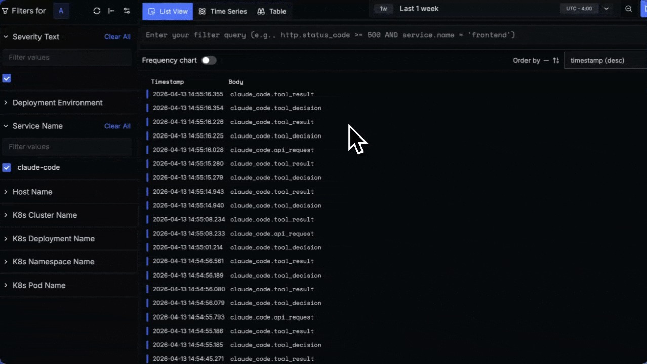 You get a chronological stream of events: claude_code.api_request, claude_code.tool_decision, claude_code.tool_result, claude_code.user_prompt. Each line has a timestamp and an event type. That's useful for admin-level questions: rough timing, how many API calls happened in a session, etc.